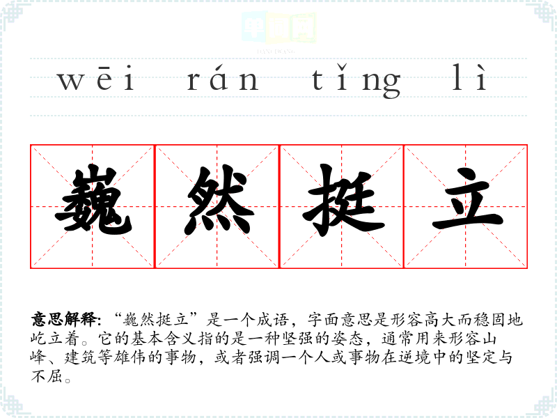 “巍然挺立”的具体来源并不明确,但“巍”字本身就有高大、雄伟的意思,常用来形容高山、大厦等;“挺立”则指坚毅地站立。这个成语在古典文学中常常用来描绘自然景观或者英雄人物的气概,反映出一种壮丽与坚韧。