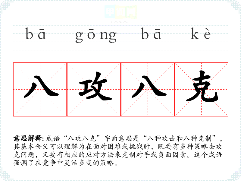 成语“八攻八克”字面意思是“八种攻击和八种克制”,其基本含义可以理解为在面对困难或挑战时,既要有多种策略去攻克问题,又要有相应的应对方法来克制对手或负面因素。这个成语强调了在竞争中灵活多变的策略。