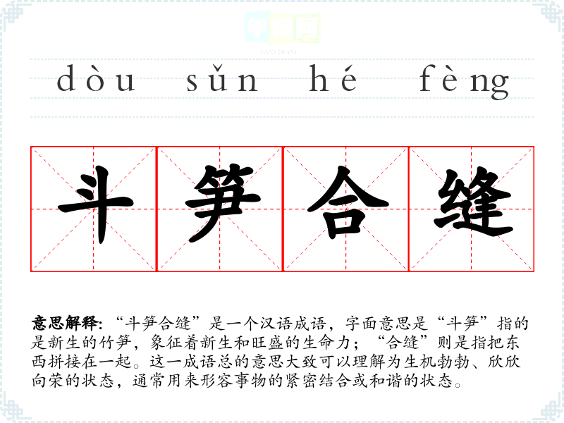 “斗笋合缝”是一个汉语成语,字面意思是“斗笋”指的是新生的竹笋,象征着新生和旺盛的生命力;“合缝”则是指把东西拼接在一起。这一成语总的意思大致可以理解为生机勃勃、欣欣向荣的状态,通常用来形容事物的紧密结合或和谐的状态。