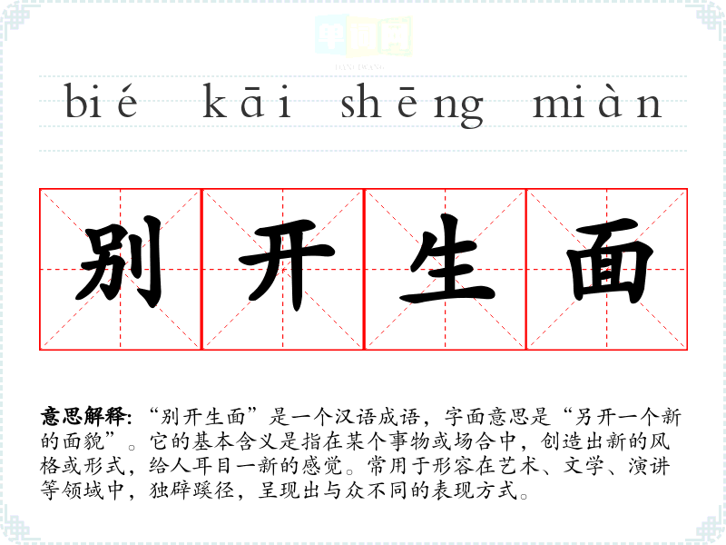 “别开生面”是一个汉语成语,字面意思是“另开一个新的面貌”。它的基本含义是指在某个事物或场合中,创造出新的风格或形式,给人耳目一新的感觉。常用于形容在艺术、文学、演讲等领域中,独辟蹊径,呈现出与众不同的表现方式。