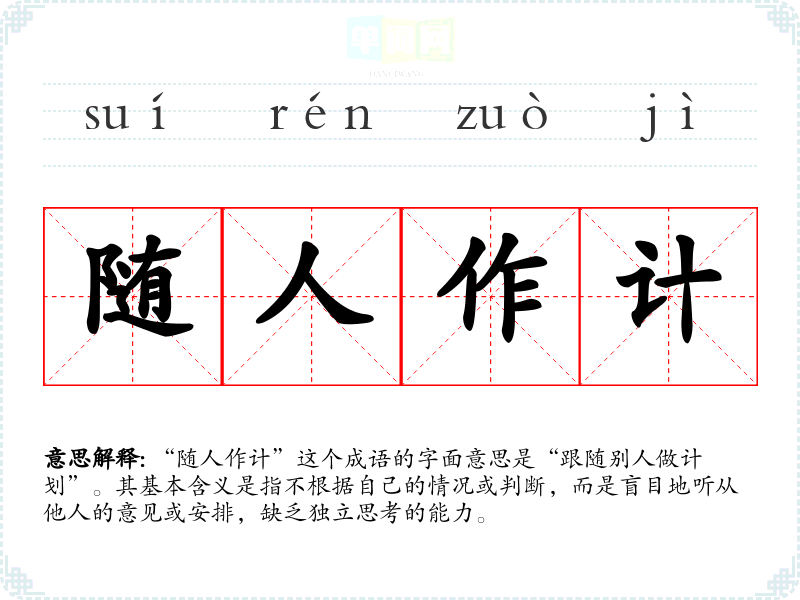 “随人作计”这个成语的字面意思是“跟随别人做计划”。其基本含义是指不根据自己的情况或判断,而是盲目地听从他人的意见或安排,缺乏独立思考的能力。