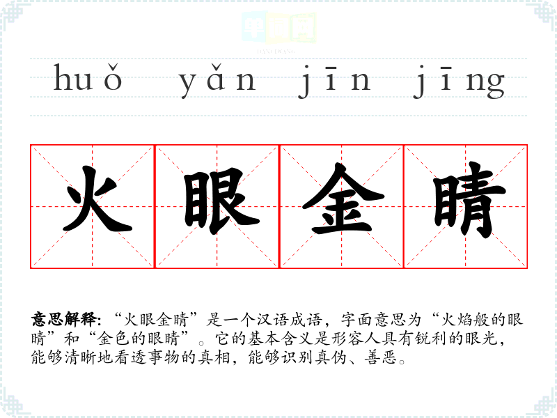 “火眼金睛”是一个汉语成语,字面意思为“火焰般的眼睛”和“金色的眼睛”。它的基本含义是形容人具有锐利的眼光,能够清晰地看透事物的真相,能够识别真伪、善恶。