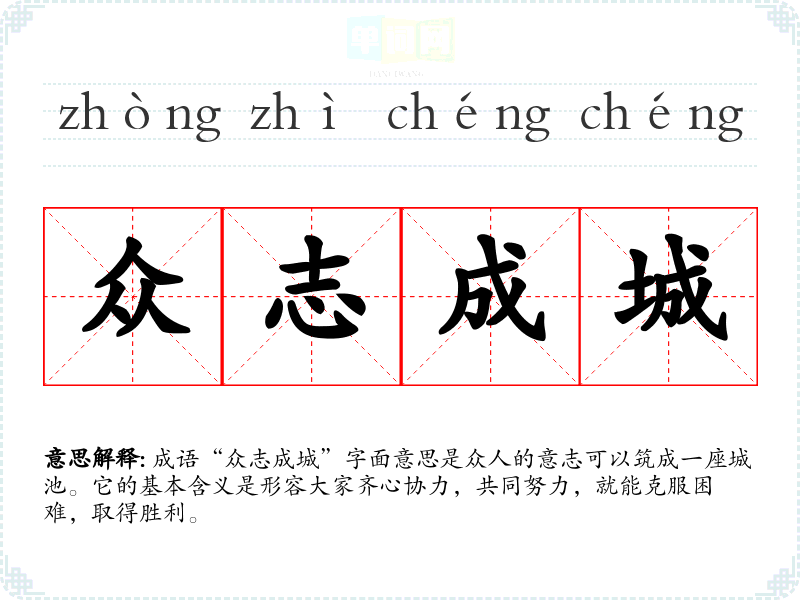 通过对“众志成城”的学,我认识到团结的力量不仅在历史和文学中得到了体现,也在现代社会中有着深远的意义。这个成语在我的语言学和表达中,提醒我重视团队合作与共同努力的重要性。