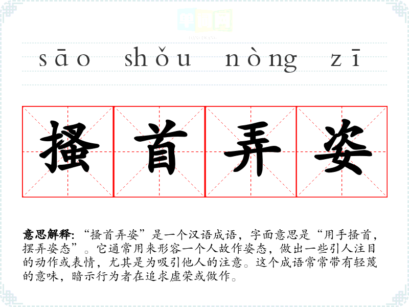 “搔首弄姿”是一个汉语成语,字面意思是“用手搔首,摆弄姿态”。它通常用来形容一个人故作姿态,做出一些引人注目的动作或表情,尤其是为吸引他人的注意。这个成语常常带有轻蔑的意味,暗示行为者在追求虚荣或做作。