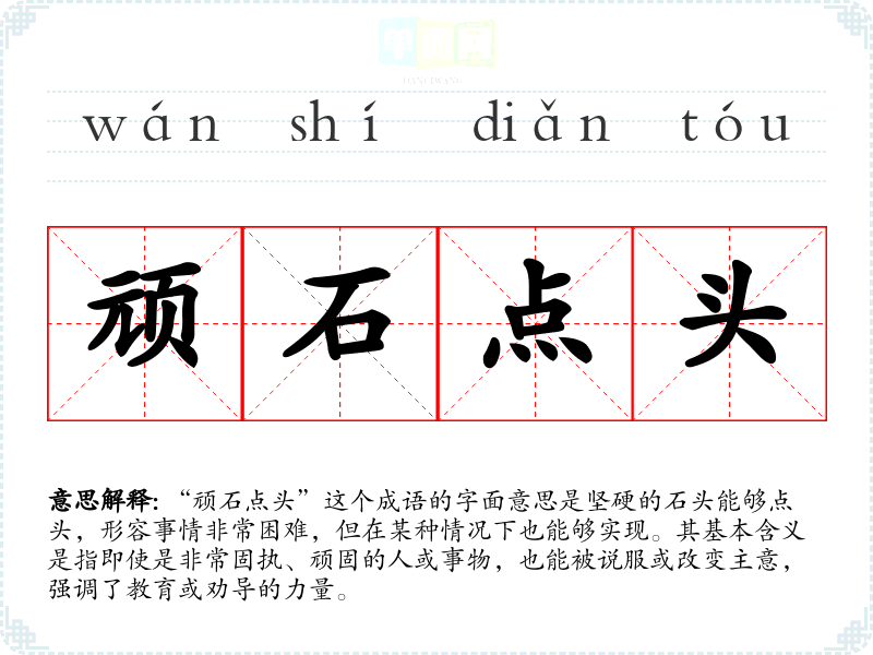 “顽石点头”这个成语的字面意思是坚硬的石头能够点头,形容事情非常困难,但在某种情况下也能够实现。其基本含义是指即使是非常固执、顽固的人或事物,也能被说服或改变主意,强调了教育或劝导的力量。
