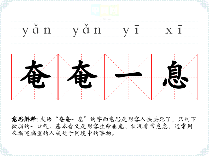 成语“奄奄一息”的字面意思是形容人快要死了,只剩下微弱的一口气。基本含义是形容生命垂危、状况非常危急,通常用来描述病重的人或处于困境中的事物。