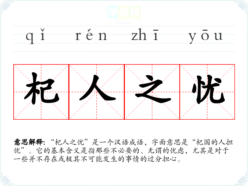 “杞人之忧”是一个汉语成语,字面意思是“杞国的人担忧”。它的基本含义是指那些不必要的、无谓的忧虑,尤其是对于一些并不存在或极其不可能发生的事情的过分担心。