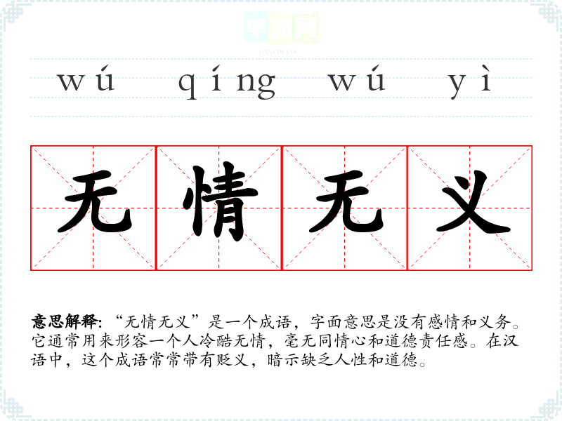 “无情无义”是一个成语,字面意思是没有感情和义务。它通常用来形容一个人冷酷无情,毫无同情心和道德责任感。在汉语中,这个成语常常带有贬义,暗示缺乏人性和道德。