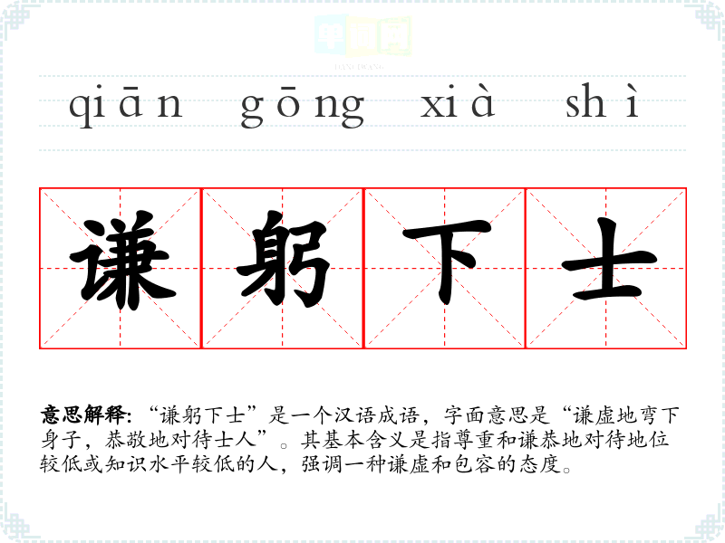 “谦躬下士”是一个汉语成语,字面意思是“谦虚地弯下身子,恭敬地对待士人”。其基本含义是指尊重和谦恭地对待地位较低或知识水平较低的人,强调一种谦虚和包容的态度。