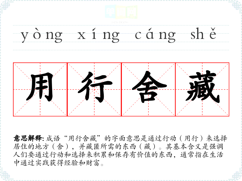 成语“用行舍藏”的字面意思是通过行动(用行)来选择居住的地方(舍),并藏匿所需的东西(藏)。其基本含义是强调人们要通过行动和选择来积累和保存有价值的东西,通常指在生活中通过实践获得经验和财富。