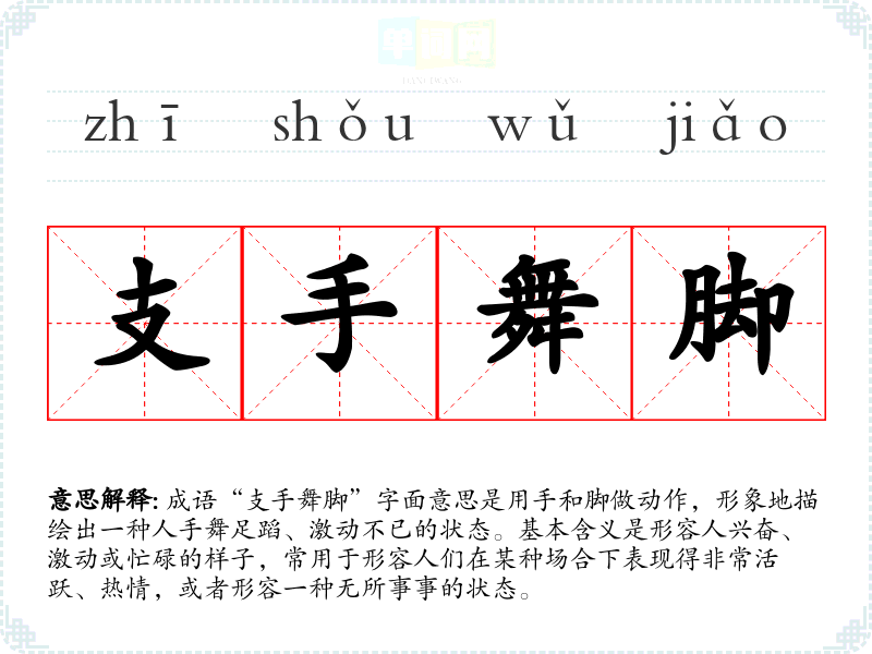 成语“支手舞脚”字面意思是用手和脚做动作,形象地描绘出一种人手舞足蹈、激动不已的状态。基本含义是形容人兴奋、激动或忙碌的样子,常用于形容人们在某种场合下表现得非常活跃、热情,或者形容一种无所事事的状态。