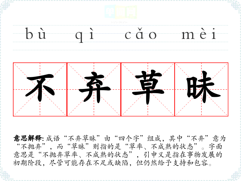 成语“不弃草昧”由“四个字”组成,其中“不弃”意为“不抛弃”,而“草昧”则指的是“草率、不成熟的状态”。字面意思是“不抛弃草率、不成熟的状态”,引申义是指在事物发展的初期阶段,尽管可能存在不足或缺陷,但仍然给予支持和包容。
