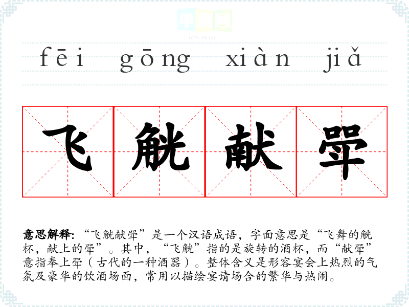“飞觥献斝”是一个汉语成语,字面意思是“飞舞的觥杯,献上的斝”。其中,“飞觥”指的是旋转的酒杯,而“献斝”意指奉上斝(古代的一种酒器)。整体含义是形容宴会上热烈的气氛及豪华的饮酒场面,常用以描绘宴请场合的繁华与热闹。