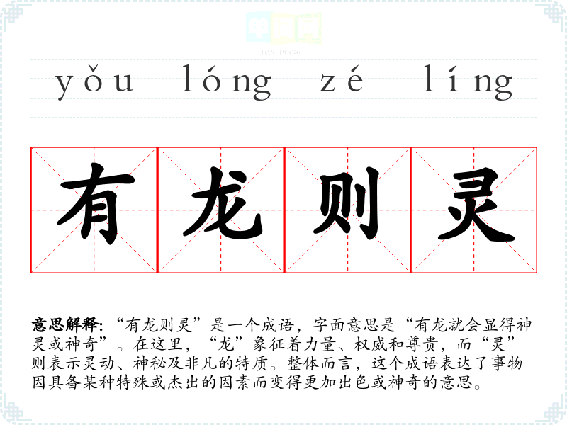 “有龙则灵”是一个成语,字面意思是“有龙就会显得神灵或神奇”。在这里,“龙”象征着力量、权威和尊贵,而“灵”则表示灵动、神秘及非凡的特质。整体而言,这个成语表达了事物因具备某种特殊或杰出的因素而变得更加出色或神奇的意思。