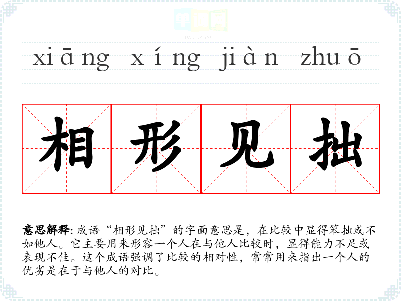 成语“相形见拙”的字面意思是,在比较中显得笨拙或不如他人。它主要用来形容一个人在与他人比较时,显得能力不足或表现不佳。这个成语强调了比较的相对性,常常用来指出一个人的优劣是在于与他人的对比。