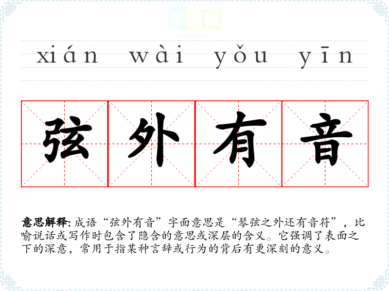 成语“弦外有音”字面意思是“琴弦之外还有音符”,比喻说话或写作时包含了隐含的意思或深层的含义。它强调了表面之下的深意,常用于指某种言辞或行为的背后有更深刻的意义。