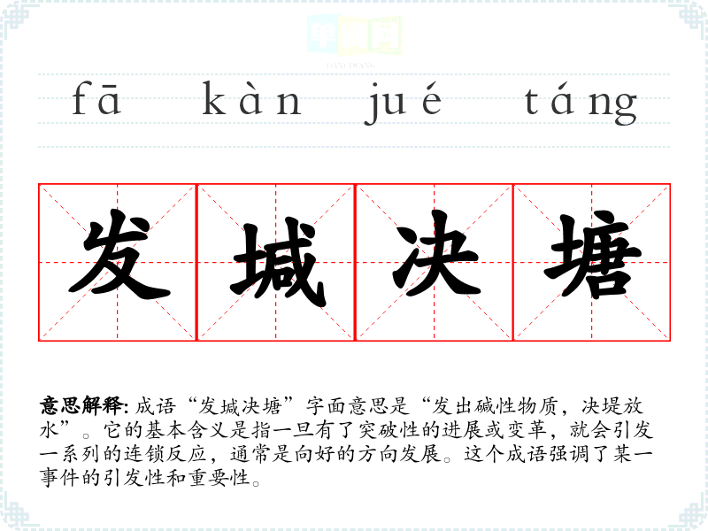 成语“发堿决塘”字面意思是“发出碱性物质,决堤放水”。它的基本含义是指一旦有了突破性的进展或变革,就会引发一系列的连锁反应,通常是向好的方向发展。这个成语强调了某一**的引发性和重要性。