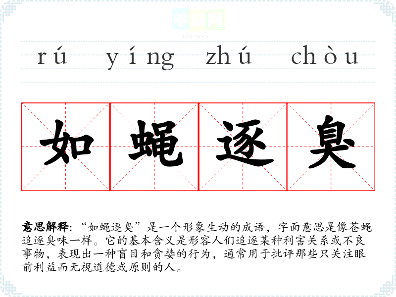 “如蝇逐臭”是一个形象生动的成语,字面意思是像苍蝇追逐臭味一样。它的基本含义是形容人们追逐某种利害关系或不良事物,表现出一种盲目和贪婪的行为,通常用于批评那些只关注眼前利益而无视道德或原则的人。