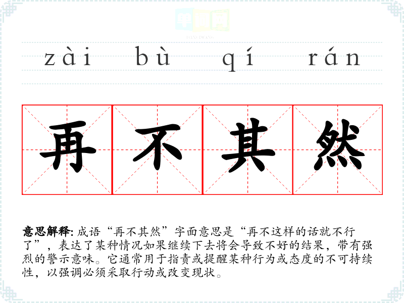 成语“再不其然”字面意思是“再不这样的话就不行了”,表达了某种情况如果继续下去将会导致不好的结果,带有强烈的警示意味。它通常用于指责或提醒某种行为或态度的不可持续性,以强调必须采取行动或改变现状。