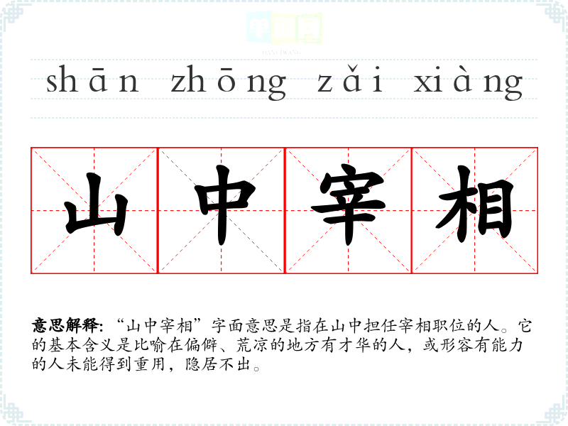 “山中宰相”字面意思是指在山中担任宰相职位的人。它的基本含义是比喻在偏僻、荒凉的地方有才华的人,或形容有能力的人未能得到重用,隐居不出。