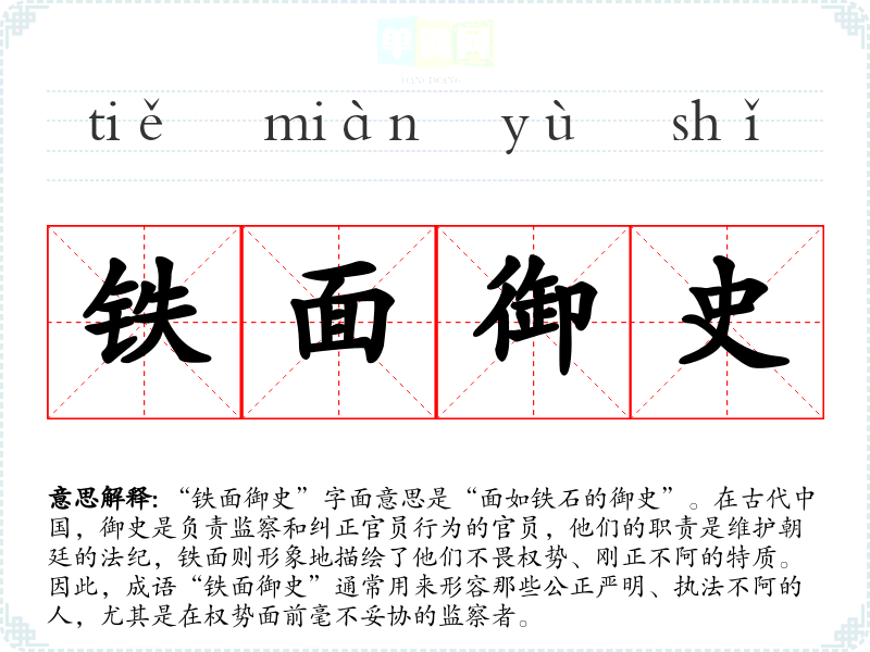 “铁面御史”源于古代的官职——御史。历史上,著名的御史如汉朝的“铁面御史”李广利,因为其严厉和公正,被后人称颂。这个成语在文学作品中多次提到,如《红楼梦》中也提及过,体现了其在文化中的深厚影响。