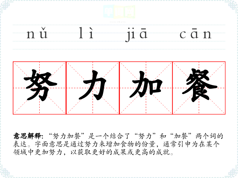 “努力加餐”是一个结合了“努力”和“加餐”两个词的表达。字面意思是通过努力来增加食物的份量,通常引申为在某个领域中更加努力,以获取更好的成果或更高的成就。