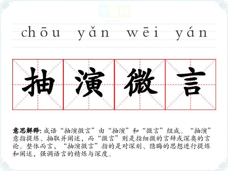 成语“抽演微言”由“抽演”和“微言”组成。“抽演”意指提炼、抽取并阐述,而“微言”则是指细微的言辞或深奥的言论。整体而言,“抽演微言”指的是对深刻、隐晦的思想进行提炼和阐述,强调语言的精炼与深度。