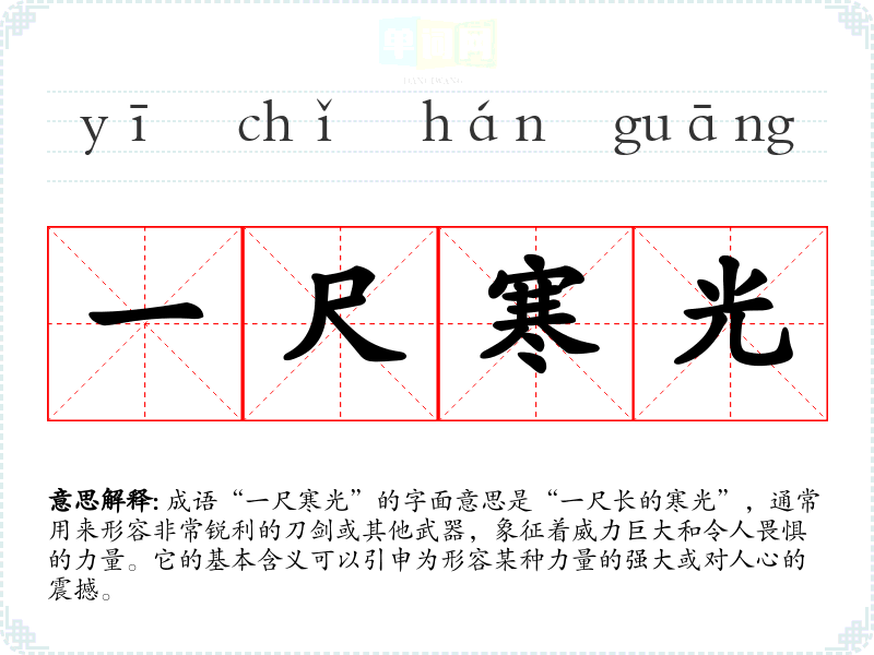 成语“一尺寒光”的字面意思是“一尺长的寒光”,通常用来形容非常锐利的刀剑或其他武器,象征着威力巨大和令人畏惧的力量。它的基本含义可以引申为形容某种力量的强大或对人心的震撼。