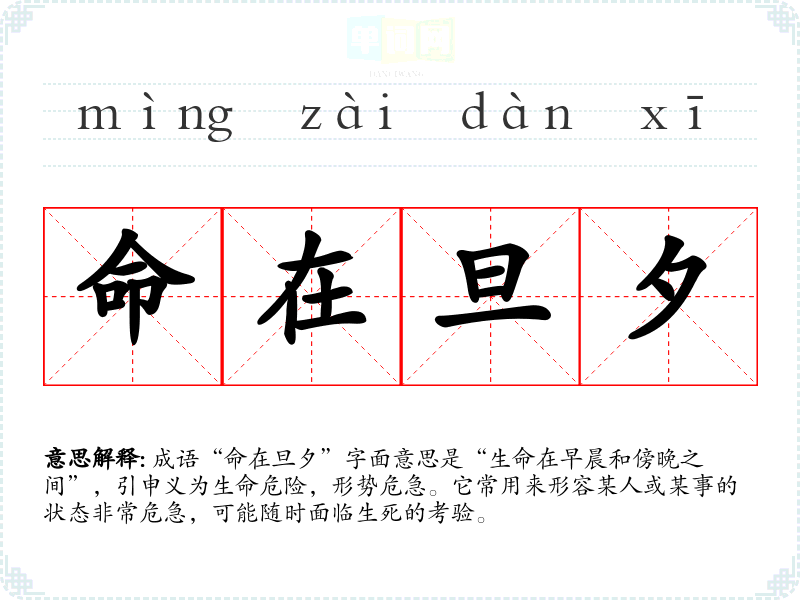成语“命在旦夕”字面意思是“生命在早晨和傍晚之间”,引申义为生命危险,形势危急。它常用来形容某人或某事的状态非常危急,可能随时面临生死的考验。
