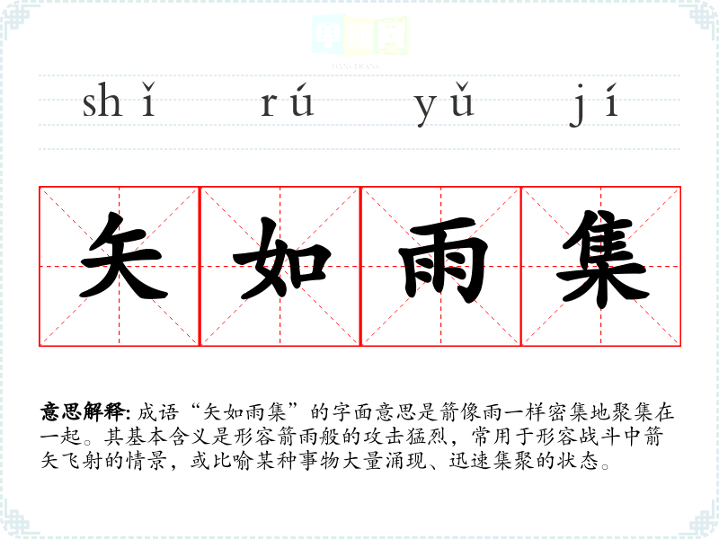 成语“矢如雨集”的字面意思是箭像雨一样密集地聚集在一起。其基本含义是形容箭雨般的攻击猛烈,常用于形容战斗中箭矢飞射的情景,或比喻某种事物大量涌现、迅速集聚的状态。