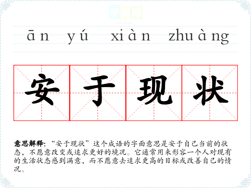 “安于现状”这个成语的字面意思是安于自己当前的状态,不愿意改变或追求更好的境况。它通常用来形容一个人对现有的生活状态感到满意,而不愿意去追求更高的目标或改善自己的情况。