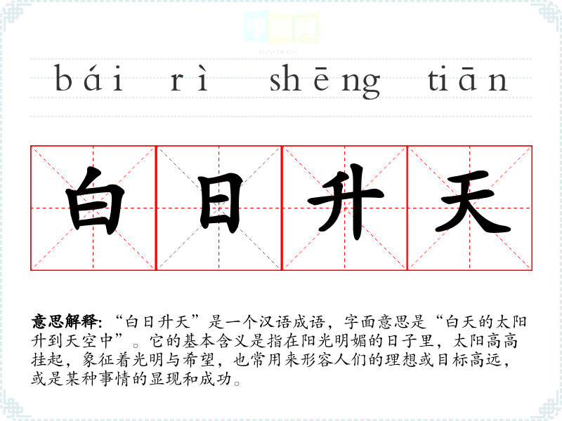 “白日升天”的具体来源并不十分明确,但可以推测其与古代诗词中对光明、升腾的描绘有关。传统文化中,太阳常常象征着光明、正义与希望,因此这个成语可以看作是对美好前景的向往和描绘。