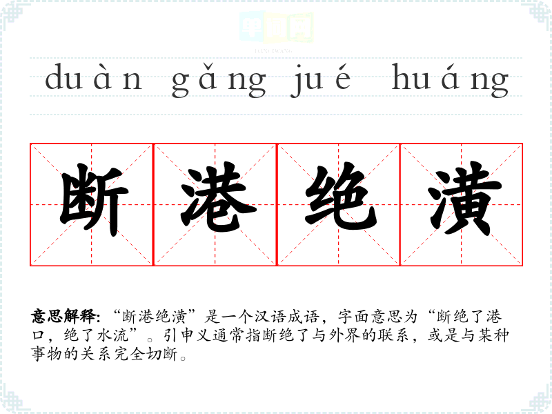 “断港绝潢”是一个汉语成语,字面意思为“断绝了港口,绝了水流”。引申义通常指断绝了与外界的联系,或是与某种事物的关系完全切断。