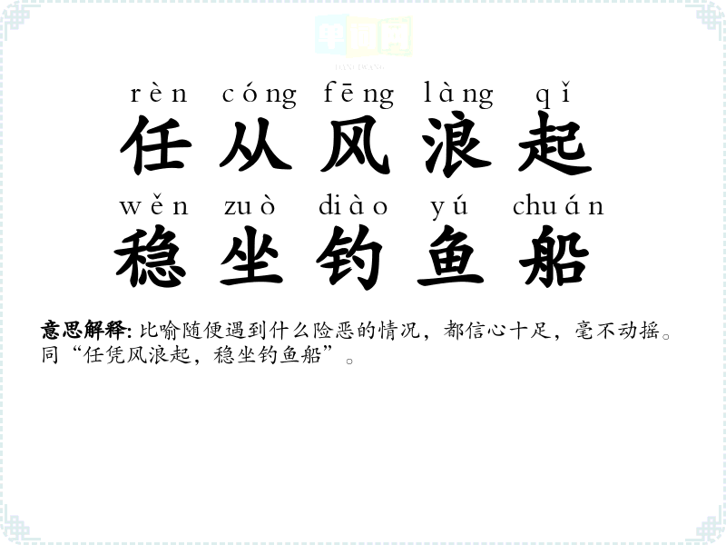 | 任从风浪起,稳坐钓鱼船 | 比喻随便遇到什么险恶的情况,都信心十足,毫不动摇。同“任凭风浪起,稳坐钓鱼船”。 |