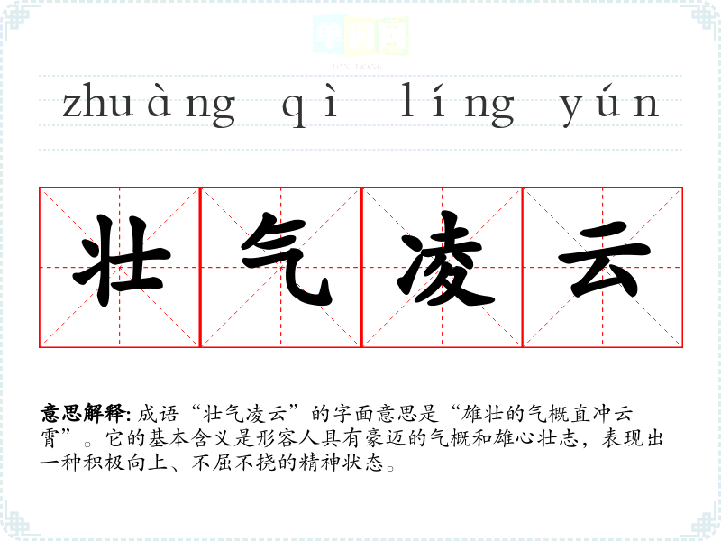 成语“壮气凌云”的字面意思是“雄壮的气概直冲云霄”。它的基本含义是形容人具有豪迈的气概和雄心壮志,表现出一种积极向上、不屈不挠的精神状态。