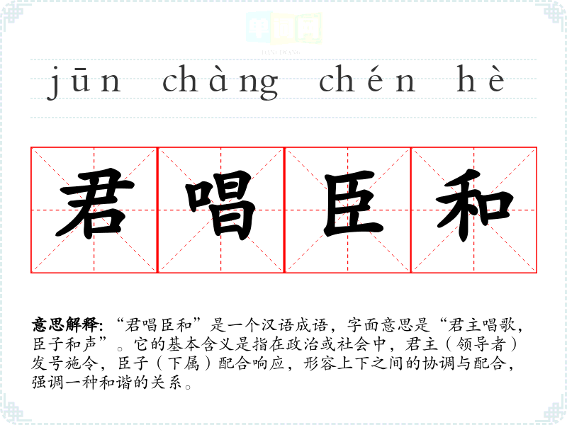 “君唱臣和”是一个汉语成语,字面意思是“君主唱歌,臣子和声”。它的基本含义是指在政治或社会中,君主(领导者)发号施令,臣子(下属)配合响应,形容上下之间的协调与配合,强调一种和谐的关系。