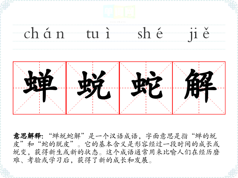 “蝉蜕蛇解”是一个汉语成语,字面意思是指“蝉的蜕皮”和“蛇的脱皮”。它的基本含义是形容经过一段时间的成长或蜕变,获得新生或新的状态。这个成语通常用来比喻人们在经历磨难、考验或学*后,获得了新的成长和发展。