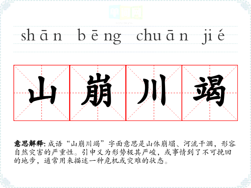 成语“山崩川竭”字面意思是山体崩塌、河流干涸,形容自然灾害的严重性。引申义为形势极其严峻,或事情到了不可挽回的地步,通常用来描述一种危机或灾难的状态。
