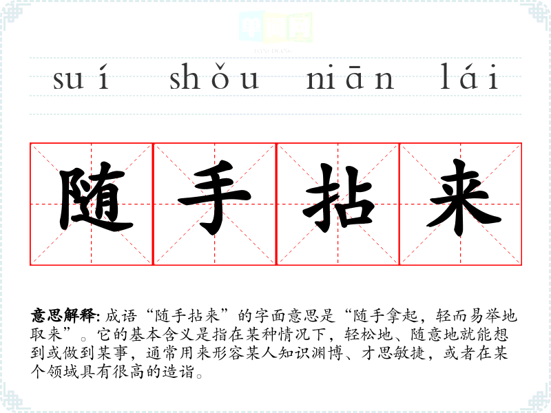 成语“随手拈来”的字面意思是“随手拿起,轻而易举地取来”。它的基本含义是指在某种情况下,轻松地、随意地就能想到或做到某事,通常用来形容某人知识渊博、才思敏捷,或者在某个领域具有很高的造诣。