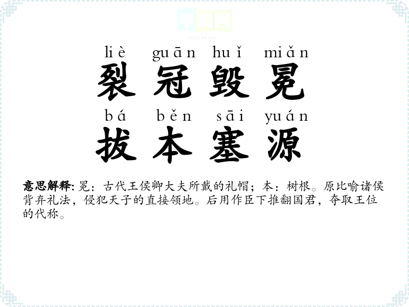 | 裂冠毁冕,拔本塞源 | 冕:古代王侯卿大夫所戴的礼帽;本:树根。原比喻诸侯背弃礼法,侵犯天子的直接领地。后用作臣下推翻国君,夺取王位的代称。 |