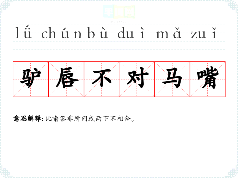 | 驴唇不对马嘴 | 比喻答非所问或两下不相合。 |
