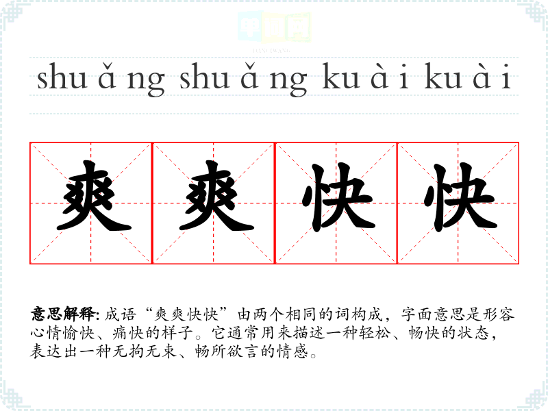 成语“爽爽快快”由两个相同的词构成,字面意思是形容心情愉快、痛快的样子。它通常用来描述一种轻松、畅快的状态,表达出一种无拘无束、畅所欲言的情感。