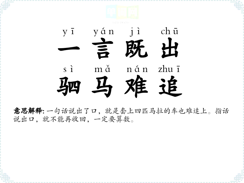 | 一言已出,驷马难追 | 指话说出口,就不能再收回,一定要算数 |