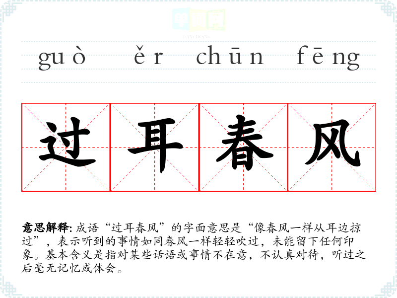 成语“过耳春风”的字面意思是“像春风一样从耳边掠过”,表示听到的事情如同春风一样轻轻吹过,未能留下任何印象。基本含义是指对某些话语或事情不在意,不认真对待,听过之后毫无记忆或体会。