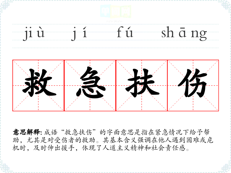 成语“救急扶伤”的字面意思是指在紧急情况下给予帮助,尤其是对受伤者的救助。其基本含义强调在他人遇到困难或危机时,及时伸出援手,体现了人道主义精神和社会责任感。