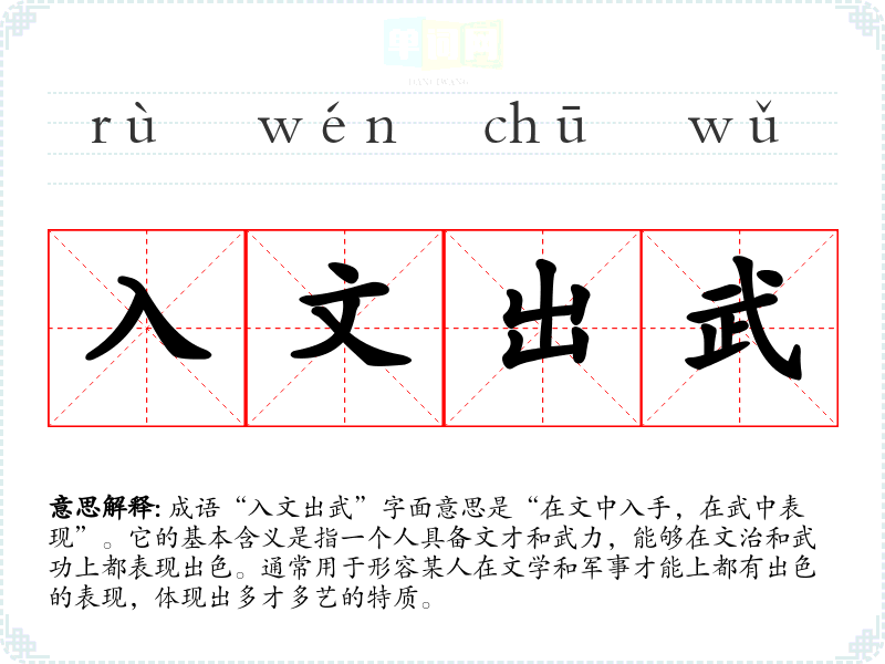 “入文出武”源自**古代对士人的期望,尤其是对那些既有文采又有武力的复合型人才的赞美。具体的历史背景可能与古代的科举制和军役制度有关,士人不仅需要通过文才获得官职,还应具备一定的武力以应对外敌。在文学作品中,可能可以追溯到古代诗词或军事著作中对这种人才的描述。