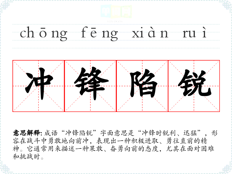 成语“冲锋陷锐”字面意思是“冲锋时锐利、迅猛”,形容在战斗中勇敢地向前冲,表现出一种积极进取、勇往直前的精神。它通常用来描述一种果敢、奋勇向前的态度,尤其在面对困难和挑战时。