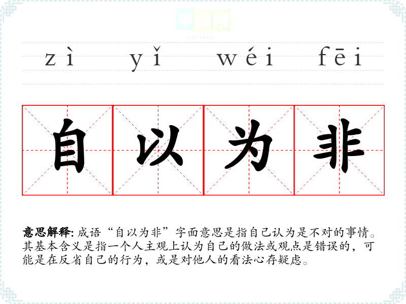 成语“自以为非”字面意思是指自己认为是不对的事情。其基本含义是指一个人主观上认为自己的做法或观点是错误的,可能是在反省自己的行为,或是对他人的看法心存疑虑。
