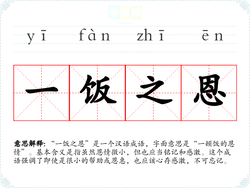 “一饭之恩”是一个汉语成语,字面意思是“一顿饭的恩情”。基本含义是指虽然恩情微小,但也应当铭记和感激。这个成语强调了即使是很小的帮助或恩惠,也应该心存感激,不可忘记。