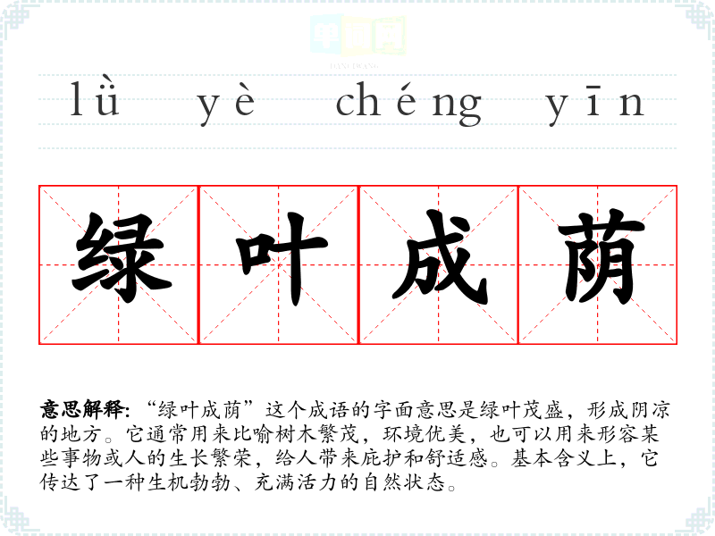 “绿叶成荫”并没有明确的历史典故来源,但它的构成可以从自然现象中理解。古人对于自然景色的描写常常充满诗意,绿叶和荫凉的结合,表达了对大自然的赞美和人们对美好环境的向往。在唐诗宋词中,常常能找到类似的意象。